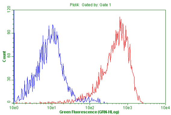 - Flow cytometric Analysis of living Jurkat cells,using anti-CD99 antibody(TA800788),(Red),compared to a nonspecific negative control antibody,(Blue).