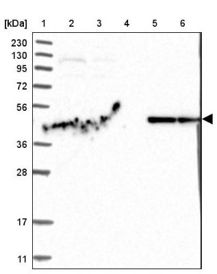 - Western Blot: PISD Antibody [NBP1-84212] - Lane 1: Marker [kDa] 230, 130, 95, 72, 56, 36, 28, 17, 11. Lane 2: Human cell line RT-4. Lane 3: Human cell line U-251MG sp. Lane 4: Human plasma (IgG/HSA depleted). Lane 5: Human liver tissue. Lane 6: Human tonsil tissue