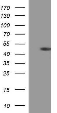 - HEK293T cells were transfected with the pCMV6-ENTRY control (Left lane) or pCMV6-ENTRY TXNDC5 (RC208568, Right lane) cDNA for 48 hrs and lysed. Equivalent amounts of cell lysates (5 µg per lane) were separated by SDS-PAGE and immunoblotted with anti-TXNDC5.