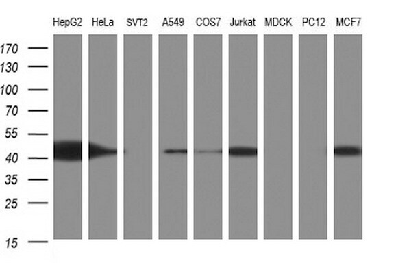 - Western blot analysis of extracts (35 µg) from 9 different cell lines by using anti-TXNDC5 monoclonal antibody (HepG2: human; HeLa: human; SVT2: mouse; A549: human; COS7: monkey; Jurkat: human; MDCK: canine; PC12: rat; MCF7: human).