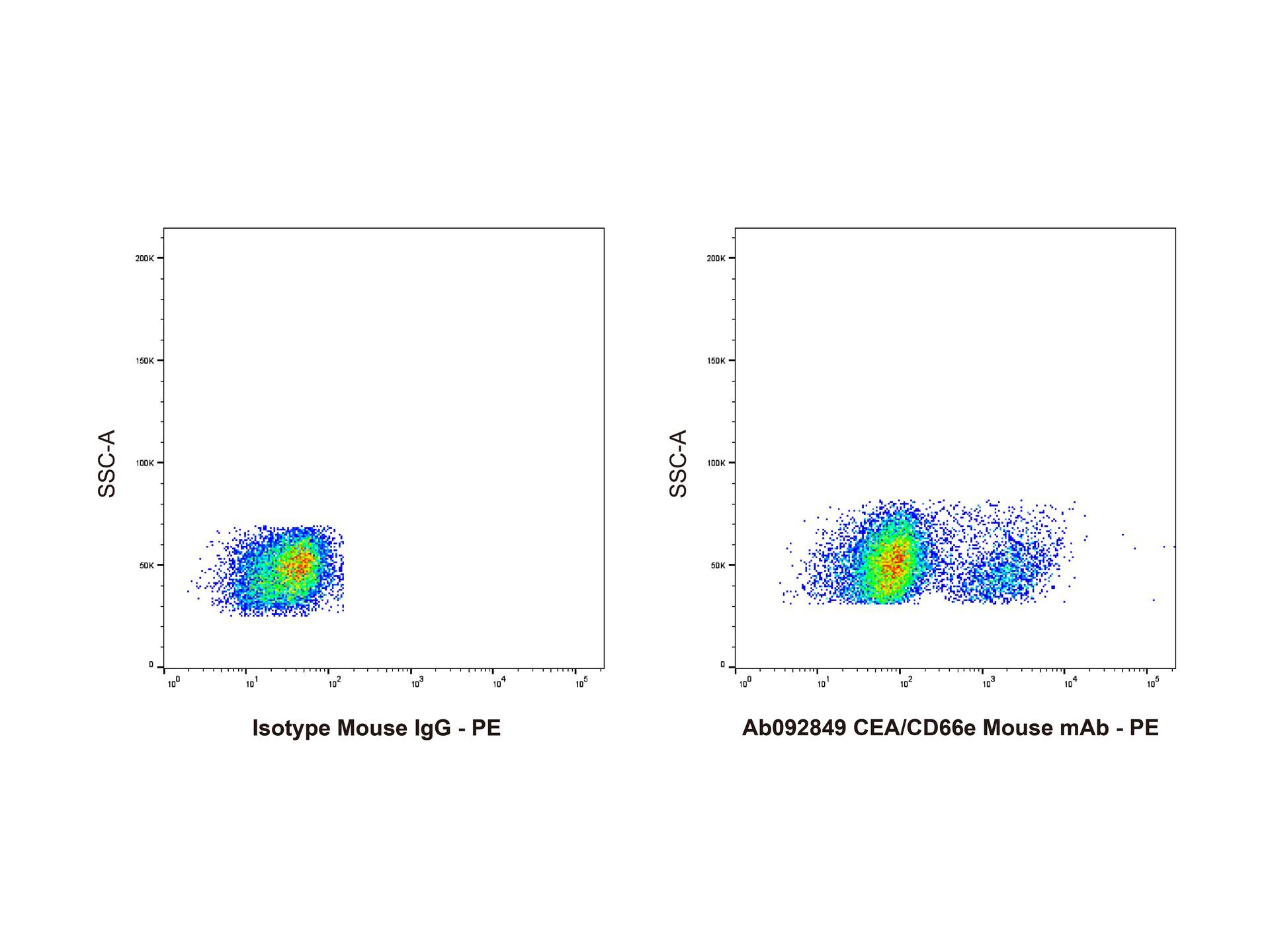 - CEA/CD66e Mouse mAb (Ab092849) - Flow Cytometry Flow Cytometry analysis of human peripheral blood lymphocytes labelling CEA/CD66e with CEA/CD66e Mouse mAb (Ab092849) (right panel) at 0.2 μg/mL for 1 hour at 4°C, compared with mouse IgG (Ab170221) - Isotype Control (left panel) and detected with Goat Anti-Mouse IgG H&L (PE) (Ab179006).
