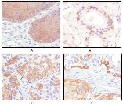 - Immunohistochemical analysis of paraffin-embedded human esophagus epithelium (A), salivary gland basal cell (B), lung squamous cell carcinoma (C), endometrium admosquamous carcinoma (D), showing cytoplasmic and membrane localization using Cytokeratin 5 monoclonal antibody (Product # MA5-15347) followed with DAB staining.
