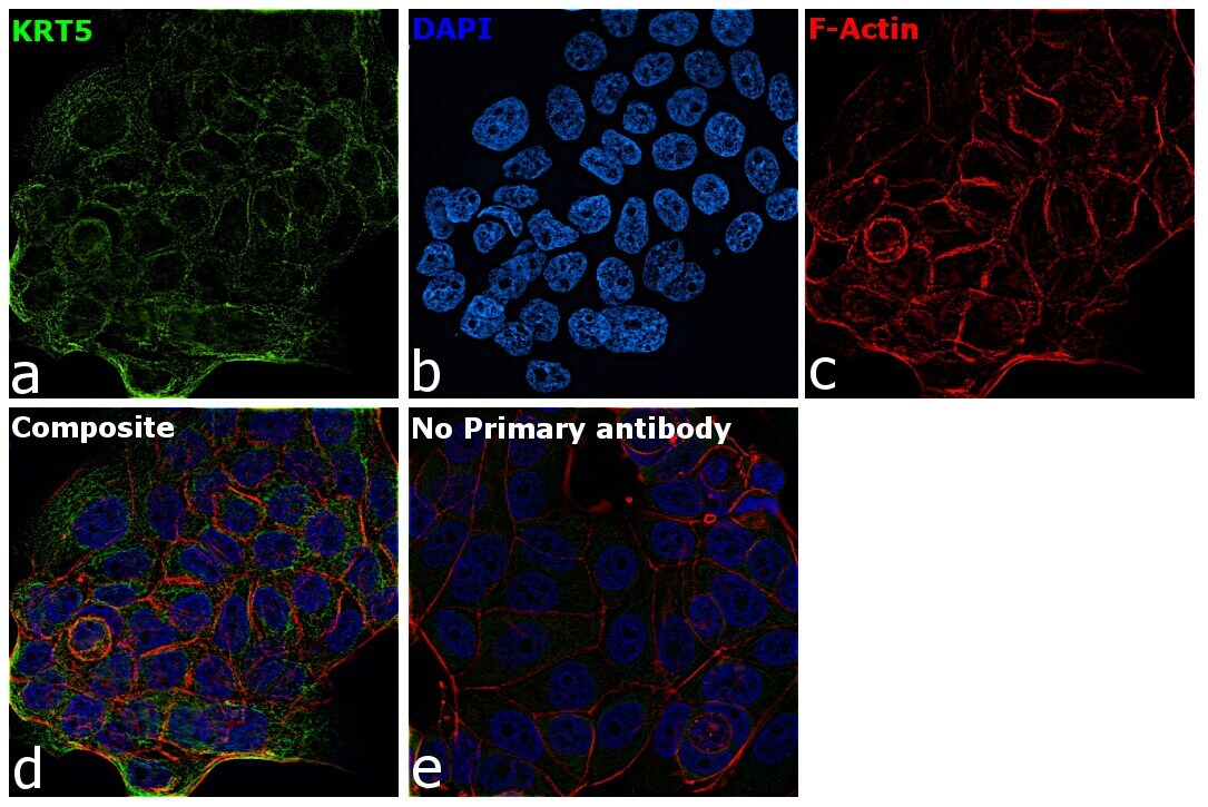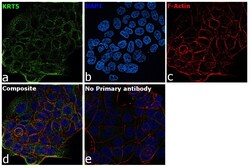 - Immunofluorescence analysis of Cytokeratin 5 was performed using 70% confluent log phase A-431 cells. The cells were fixed with 4% paraformaldehyde for 10 minutes, permeabilized with 0.1% Triton™ X-100 for 10 minutes, and blocked with 2% BSA for 45 minutes at room temperature. The cells were labeled with Cytokeratin 5 Monoclonal Antibody (3E2F1) (Product # MA5-15347) at 1:200 dilution in 0.1% BSA, incubated at 4 degree celsius overnight and then labeled with Goat anti-Mouse IgG (H+L) Superclonal™ Recombinant Secondary Antibody, Alexa Fluor® 488 conjugate (Product # A28175), (1:2000 dilution), for 45 minutes at room temperature (Panel a: Green). Nuclei (Panel b:Blue) were stained with SlowFade® Gold Antifade Mountant with DAPI (Product # S36938). F-actin (Panel c: Red) was stained with Rhodamine Phalloidin (Product # R415, 1:300 dilution). Panel d represents the merged image showing cytoskeletal localization. Panel e represents control cells with no primary antibody to assess background. The images were captured at 60X magnification.