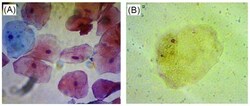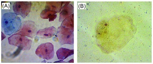 - Figure 1. Palatal epithelial cells stained by Papanicolaou (x400) ( A ) and immunohistologically stained for cytokeratin 5 ( B ) (x400). Basal cells are stained as blue color. Intermediate and superficial are stained as pink and orange color, respectively. Cytokeratin 5 protein is stained as brown color in nucleus and cytoplasm.