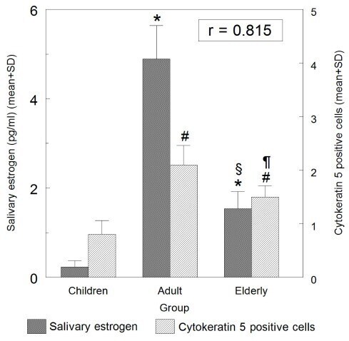 - Figure 2. The correlation between the levels of salivary estrogen and cytokeratin 5-positive oral epithelial cells. *p