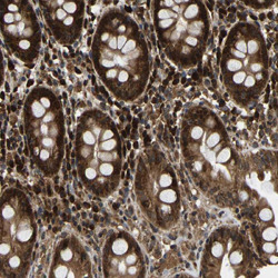 - Immunohistochemical staining of human rectum with DNAJC25-GNG10 polyclonal antibody (Cat # PAB27473) shows strong cytoplasmic positivity in glandular cells at 1:200-1:500 dilution.
