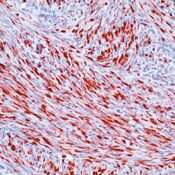- Formalin-fixed, paraffin-embedded human leiomyoma stained with Desmin antibody using peroxidase-conjugate and AEC chromogen. Note cytoplasmic staining of muscle cells.