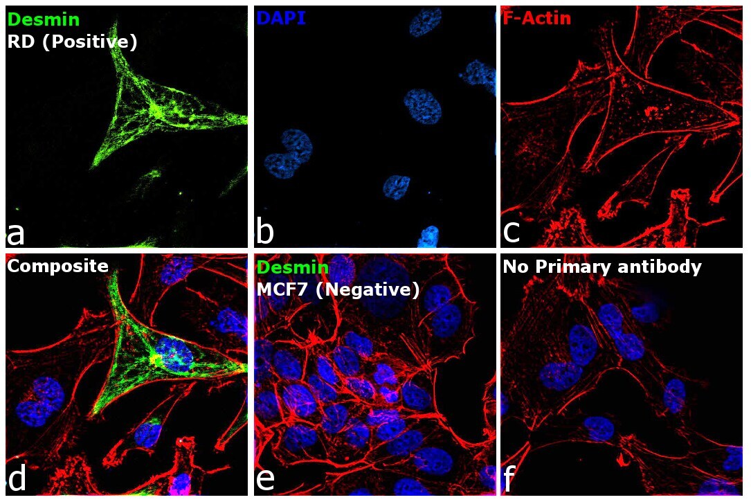 - Immunofluorescence analysis of desmin was performed using 70% confluent log phase RD cells. The cells were fixed with 4% paraformaldehyde for 10 minutes, permeabilized with 0.1% Triton™ X-100 for 15 minutes, and blocked with 2% BSA for 1 hour at room temperature. The cells were labeled with Desmin Monoclonal Antibody (D33) (Product # MA5-13259) at 1:100 dilution in 0.1% BSA, incubated at 4 degree celsius overnight and then labeled with Donkey anti-Mouse IgG (H+L) Highly Cross-Adsorbed Secondary Antibody, Alexa Fluor Plus 488 (Product # A32766, 1:2000 dilution), for 45 minutes at room temperature (Panel a: Green). Nuclei (Panel b: Blue) were stained with ProLong™ Diamond Antifade Mountant with DAPI (Product # P36962). F-actin (Panel c: Red) was stained with Rhodamine Phalloidin (Product # R415, 1:300). Panel d represents the merged image showing cytoskeletal localization. Panel e represents MCF7 cells with no expression of Desmin. Panel f represents control cells with no primary antibody to assess background. The images were captured at 60X magnification.