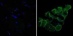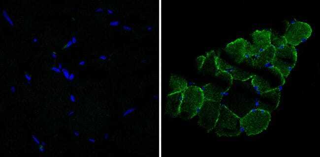 - Immunofluorescent analysis of Desmin (green) showing staining in the cytoplasm of human skeletal muscle (right) compared to a negative control without primary antibody (left). Formalin-fixed cells were permeabilized with 0.1% Triton X-100 in TBS for 5-10 minutes and blocked with 3% BSA-PBS for 30 minutes at room temperature. Cells were probed with a Desmin monoclonal antibody (Product # MA5-13259) in 3% BSA-PBS at a dilution of 1:20 and incubated overnight at 4ºC in a humidified chamber. Cells were washed with PBST and incubated with a DyLight-conjugated secondary antibody in PBS at room temperature in the dark. F-actin (red) was stained with a fluorescent red phalloidin and nuclei (blue) were stained with Hoechst or DAPI. Images were taken at a magnification of 60x.