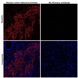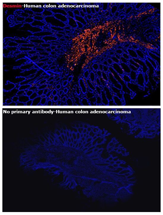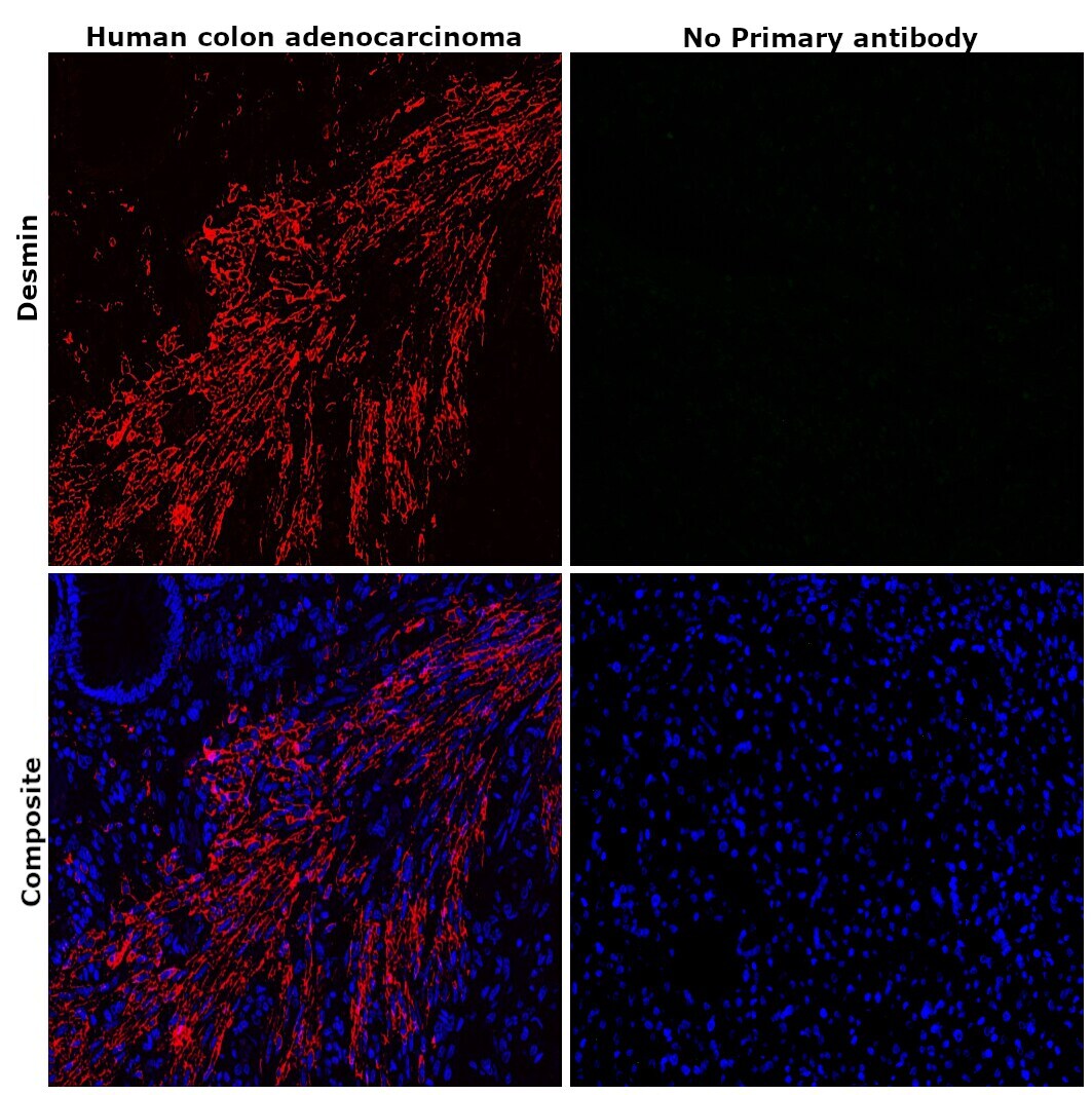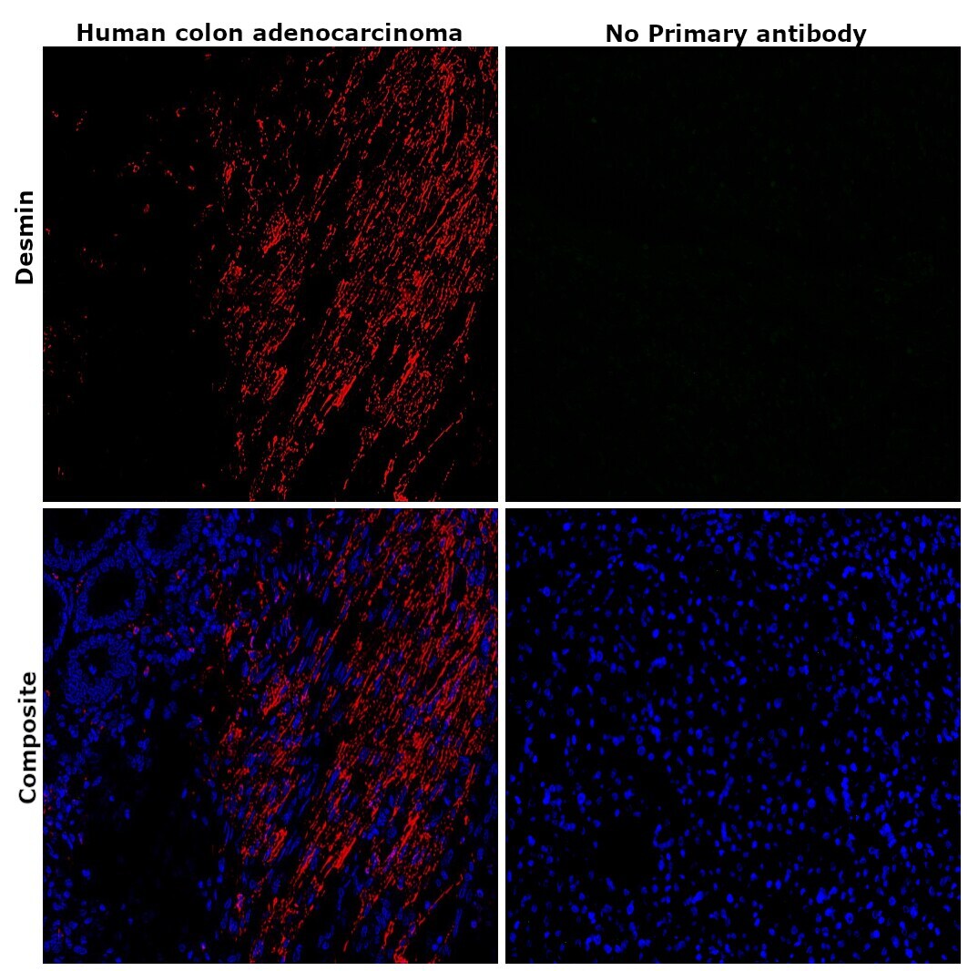 - Immunohistochemical analysis of desmin was performed using formalin-fixed paraffin-embedded human colon adenocarcinoma tissue sections. To expose the target protein, heat-induced epitope retrieval was performed on de-paraffinized sections using eBioscience™ IHC Antigen Retrieval Solution - Low pH (10X) (Product # 00-4955-58) diluted to 1X solution in water in a decloaking chamber at 110 degree Celsius for 15 minutes. Following antigen retrieval, the sections were blocked with 3% H2O2 for 1 h at toom temperature followed by 2% normal goat serum in 1X PBS for 45 minutes at room temperature. The sections were then probed with or without Desmin Monoclonal Antibody (D33) (Product # MA5-13259) at 1:5000 dilution in 0.1% normal goat serum overnight at 4 degree Celsius in a humidified chamber. Detection was performed using Alexa Fluor™ 647 Tyramide SuperBoost™ Kit, goat anti-mouse IgG (Product # B40916). Nuclei were stained with DAPI (Product # D1306) and the sections were mounted using ProLong™ Glass Antifade Mountant (Product # P36984). The images were captured on EVOS™ M7000 Imaging System (Product # AMF7000) at 20X magnification and externally deconvoluted.
