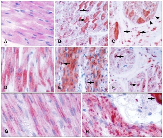 - Fig. 1 (A) Diffuse moderate immunolabeling for heat shock protein70 (HSP70) in cardiomyocytes of a control heart. (B) Dense immunolabeling of some foot-and-mouth disease virus (FMDV)-infected cardiomyocytes. Note the cytoplasmic and perinuclear (arrows). (C) Granularly sarcolemmal (arrowheads) and extracellular (arrows) localization of HSP70 immunolabeling. (D) alpha-BC immunolabeling in cross striations of cardiomyocytes in a control heart. (E) Abnormal accumulation of alpha-BC with coarse granules (arrows) in severely affected cardiomyocytes in a FMDV-infected heart. (F) Perinuclear localization of alpha-BC in the cross section of a FMDV-infected heart (arrows). (G) Desmin immunoreactivity in cross striations of cardiomyocytes from a control heart. (H) Abnormal distribution of desmin immunolabeling with a granular pattern in a FMDV-infected heart. Arrow indicates dense immunoreaction of Purkinje fibers. Immunohistochemical staining with streptavidin-biotin peroxidase complex (SABC) and 3-amino-9-ethylcarbazole (AEC), and counterstaining with Mayer's hematoxylin. A-D: x320, E and F: x160, G and H: x380.