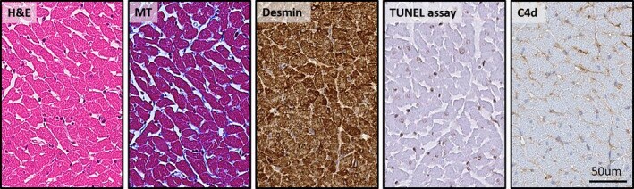 - Figure 1 Ventricular myocardium irradiated with 30 Gy at 4 weeks. Irradiated left ventricular free wall subendocardium of rats was stained with hematoxylin and eosin (H&E), Masson trichrome (MT), and immunohistochemistry (Desmin, TUNEL [terminal deoxynucleotidal transferase-mediated biotin-deoxyuridine triphosphate nick-end labeling] assay, and C4d immunostaining). Myocyte necrosis and apoptosis were not observed in rat hearts irradiated by 20 to 50 Gy. Intercellular space (interstitium) was widened but not fibrotic. Cellular rupture and destruction of myocytes were not observed. (x400 Magnification.)