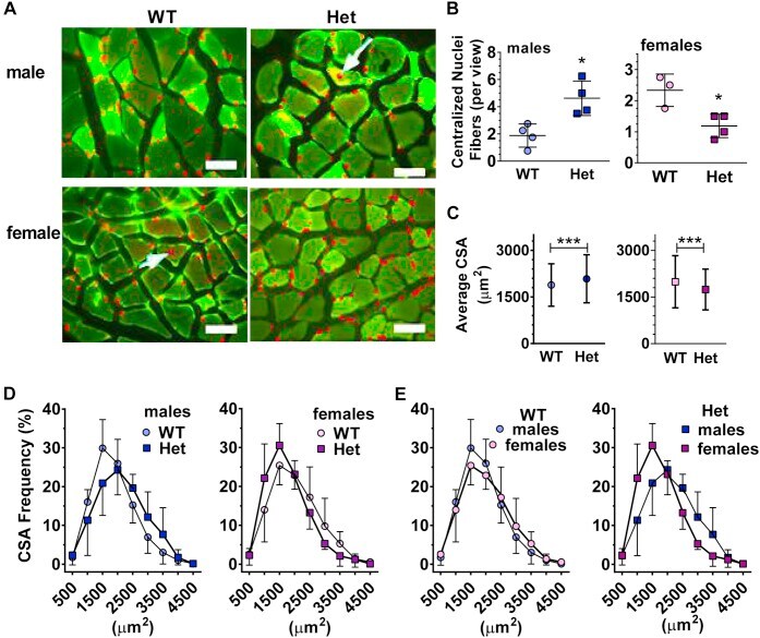 - Figure 4 Rdh10+/- (Het) males and females differ from each other and WT in muscle fiber characteristics. A , desmin immunostaining combined with DAPI staining of GM cryosections. The arrows denote centralized nuclei. Bars = 50 mum. Images were overexposed to allow visualization of nuclei. B , quantification of average number of fibers with centralized nuclei per field of view using H&E staining (averages of 3-48 sections from each of 3-4 mice), * p < 0.02. C , average CSA/mouse (1454-1635 individual fibers quantified for each sex and genotype). D and E , the ranges of the CSA frequency distribution of data in C .