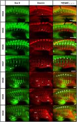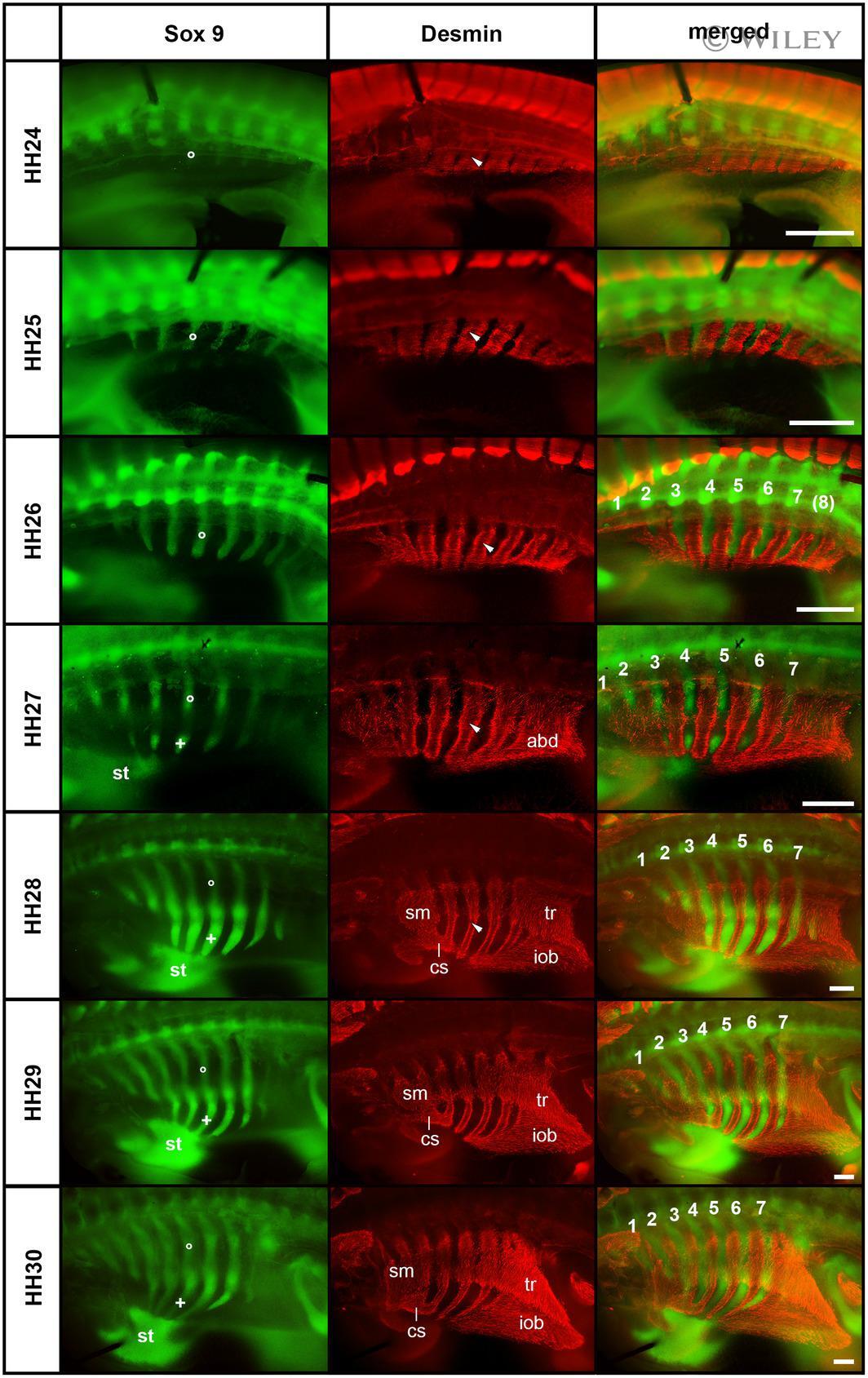 - 6 FIGURE Double whole-mount immunohistochemical stainings of the chicken thorax of HH-stage 24-30 using antibodies against Sox9 (green, left column) and Desmin (red, middle column) and overlays of both markers (right column). Dorsal is to the top and cranial is to the left, medial view. Sox9 is a marker of the chondrogenic lineage labelling the ribs, and Desmin is a marker of the myogenic lineage labelling musculature. Rib anlagen are numbered from Th1 to Th7. Arrowhead, intercostal muscle anlage. deg costal process and vertebral rib. + sternal rib. Abd, abdominal musculature before separation in anatomical muscle anlagen. Cs, costosternal muscle anlage; Iob, internal oblique abdominal muscle; Sm, putative anlage of the scalenus muscle; St, sternum; Tr, transverse abdominal muscle. Scale bar 500 mum.