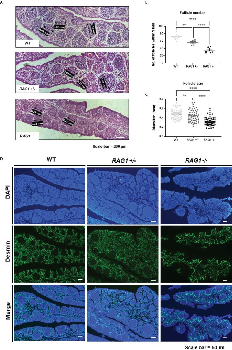 - Impaired development of embryonic B cell bursa follicle. (A) Histological images of WT, RAG1 +/- , and RAG1 -/- E18 bursa. The number of follicles (B) and diameter (C) of bursa follicles within 1-fold of bursa. The significance of differences among groups was calculated by one-way ANOVA; ns, no significance, ** P < 0.01 and **** P < 0.0001. (D) Embryonic bursa sections were stained with desmin at E18 to identify bursa follicle compartmentalization.