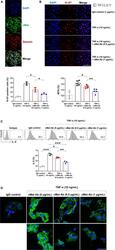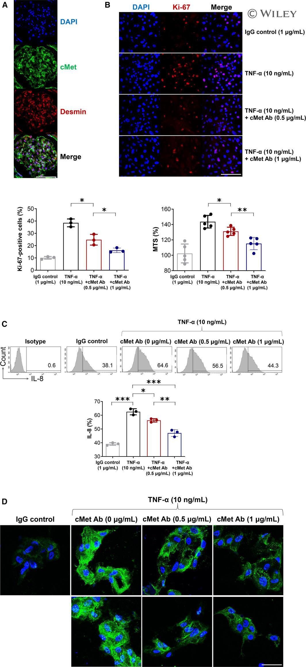 - 4 Figure Proliferation and inflammation of mesangial cells alleviated by cMet Ab treatment. A, Observation of cMet and desmin (a mesangial cells marker) expressions which are confirmed to merge well at the same site. Magnification: 800x (bar = 50 mum). B, Ki-67-positive cell expression and proliferation were increased after TNF-alpha stimulation and decreased dose-dependently after cMet Ab treatment. The data shown are representative of three independent experiments (N = 3/group; N = 5/group). Magnification: 400x (bar = 100 mum). C, Flow cytometry showed that the IL-8 + cells increased by approximately 1.7 times by TNF-alpha stimulation compared to the control. A dose-dependent decrease was observed on treatment with cMet Ab (N = 3/group). D, ICAM-1 expression was also increased on TNF-alpha stimulation; it was seen to reduce after cMet Ab treatment. Magnification: 800x (bar = 50 mum). The data shown are representative of three independent experiments. All data are presented as the mean +- SEM. * P < .05 (unpaired t test); ** P < .01 (unpaired t test); *** P < .001 (unpaired t test)