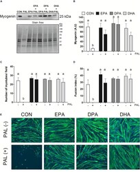 - FIGURE 4 EPA, DPA, and DHA protect against the inhibitory effects of PAL on myotube differentiation. Protein expression of the myogenic protein myogenin 120 h following treatment with 500 muM PAL and/or 50 muM EPA, DPA, or DHA, with a representative image of a stain free blot used for normalization shown with molecular weight markers indicated (A) . Quantified protein expression of the myogenic protein myogenin (B) . All densitometry values are expressed relative to protein content determined by stain free imaging and presented in arbitrary units relative to CON. Treatments that do not share letters are considered statistically significant ( p < 0.05; n = 6 biological replicates). Average number of myotubes/field (C) and fusion index (number of nuclei in tubes relative to the total number of nuclei expressed as a percentage) (D) . Representative images of each treatment group at 120 h ( n = 3 biological replicates) (E) . Scale bar represents 275 mum. Values are presented as mean +- SEM.