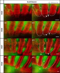 - 7 FIGURE Close-ups showing the differentiation front of ribs and intercostal muscles in the ventrolateral body wall. Double whole-mount immunohistochemical stainings of the chicken thorax of HH-stages 25-28 using antibodies against Sox9 (green) and Desmin (red) in an overlay of both markers in the same embryo. Dorsal is to the top and cranial is to the left, medial view. The left column (a-d) shows the original stainings, and the right column (a' to d') shows the identical specimens, with the outline of the rib and intercostal muscle anlagen drawn in for clarity. Note that the muscle anlagen extend more ventrally than the rib anlagen (a-c), and reach the same ventral level only at HH-stage 28 when both anlagen have reached the sternum (d). Arrowhead, distal tip of intercostal muscle anlagen showing loose and variable muscle fibres. Arrow, muscle fibres extending into the domain of the prospective rib anlage. deg, costal process and vertebral rib anlage. +, sternal rib anlage. St, sternal anlage. Scale bar 100 mum.