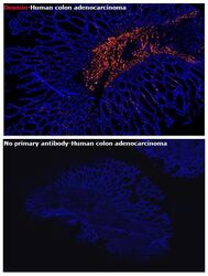 - Immunohistochemical analysis of desmin was performed using formalin-fixed paraffin-embedded human colon adenocarcinoma tissue sections. To expose the target protein, heat-induced epitope retrieval was performed on de-paraffinized sections using eBioscience™ IHC Antigen Retrieval Solution - Low pH (10X) (Product # 00-4955-58) diluted to 1X solution in water in a decloaking chamber at 110 degree Celsius for 15 minutes. Following antigen retrieval, the sections were blocked with 3% H2O2 for 1 h at toom temperature followed by 2% normal goat serum in 1X PBS for 45 minutes at room temperature. The sections were then probed with or without Desmin Monoclonal Antibody (D33) (Product # MA5-13259) at 1:5000 dilution in 0.1% normal goat serum overnight at 4 degree Celsius in a humidified chamber. Detection was performed using Alexa Fluor™ 647 Tyramide SuperBoost™ Kit, goat anti-mouse IgG (Product # B40916). Nuclei were stained with DAPI (Product # D1306) and the sections were mounted using ProLong™ Glass Antifade Mountant (Product # P36984). The images were captured on EVOS™ M7000 Imaging System (Product # AMF7000) at 20X magnification.