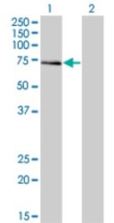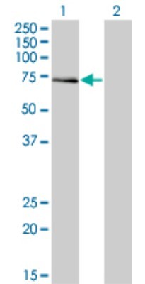 - Western Blot: GTF2A1L Antibody (3E4) [H00011036-M05] - Analysis of ALF expression in transfected 293T cell line by ALF monoclonal antibody (M05), clone 3E4. Lane 1: ALF transfected lysatE (52.4 KDa). Lane 2: Non-transfected lysate.