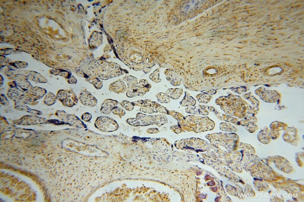 - Immunohistochemistry of paraffin-embedded human placenta using 16352-1-AP (PSG11 antibody) at dilution of 1:100 (under 10x lens).