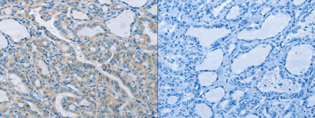 - The image on the left is immunohistochemistry of paraffin-embedded Human thyroid cancer tissue using (NEK5 Antibody) at dilution 1/60, on the right is treated with synthetic peptide. (Original magnification: ?200)