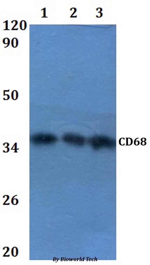 - Western blot (WB) analysis of CD68 pAb at 1:500 dilution Line1:A549 whole cell lysateLine2:PC12 whole cell lysateLine3:sp20 whole cell lysate