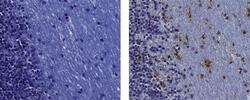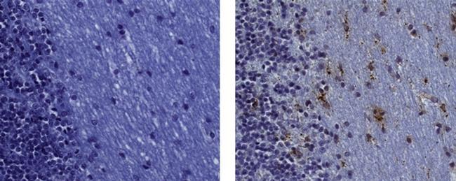 - Immunohistochemistry on formalin-fixed paraffin embedded human cerebellar white matter, using 1 µg/mL of Mouse IgG1 Isotype Control (left) or 1 µg/mL of Anti-Human CD68 Purified (right) followed by biotinylated Anti-Mouse IgG, and DAB visualization. Nuclei are counterstained with hematoxylin.