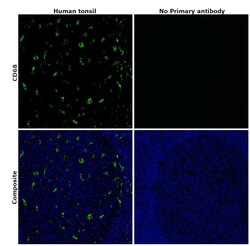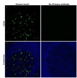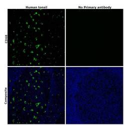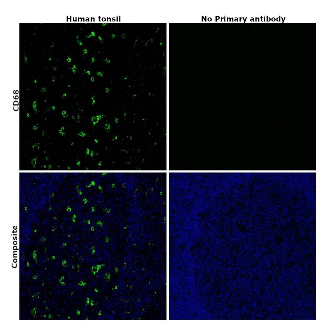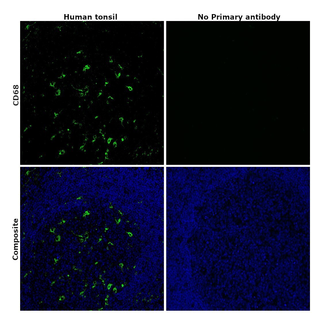 - Immunohistochemical analysis of CD68 was performed using formalin-fixed paraffin-embedded human tonsil tissue sections. To expose the target protein, heat-induced epitope retrieval was performed on de-paraffinized sections using eBioscience™ IHC Antigen Retrieval Solution - High pH (10X) (Product # 00-4956-58) diluted to 1X solution in water in a microwave oven at 100 degree Celsius for 15 minutes. Following antigen retrieval, the sections were blocked with 2% normal goat serum in 1X PBS for 45 minutes at room temperature and then probed with or without CD68 Monoclonal Antibody (KP1), eBioscience™ (Product #14-0688-82) at 5 µg/mL in 0.1% normal goat serum overnight at 4 degree Celsius in a humidified chamber. Detection was performed using Goat anti-Mouse IgG (H+L) Highly Cross-Adsorbed Secondary Antibody, Alexa Fluor Plus 488 (Product # A32723) at a dilution of 1:2000 in 0.1% normal goat serum for 45 minutes at room temperature. ReadyProbes™ Tissue Autofluorescence Quenching Kit (Product # R37630) was used to quench autofluorescence from the tissues. Nuclei were stained with DAPI (Product # D1306) and the sections were mounted using ProLong™ Glass Antifade Mountant (Product # P36984). The images were captured on EVOS™ M7000 Imaging System (Product # AMF7000) at 20X magnification and externally deconvoluted.