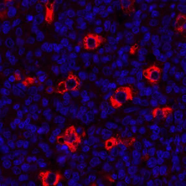 - Detection of human CD68 by immunohistochemistry.Sample: FFPE section of human tonsil.Antibody: Mouse monoclonal anti-CD68 antibody [KP-1] (Product # A500-018A lot 1) used at 1:100.Secondary: DyLight® 594-conjugated goat anti-mouse IgG (A90-116D4).