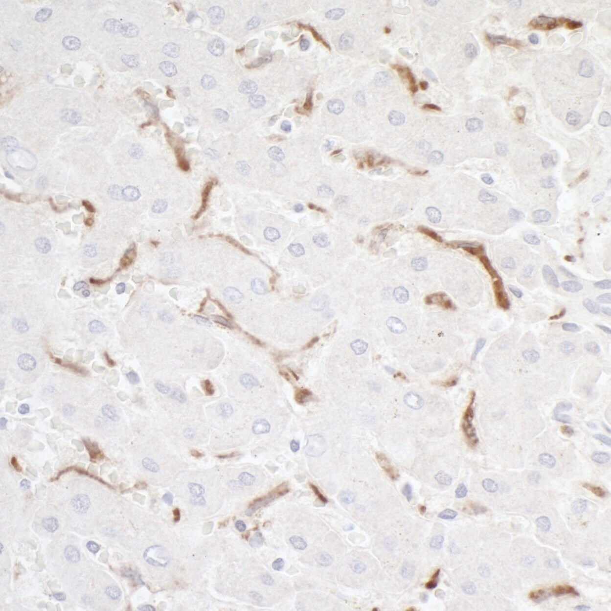 - Detection of human CD68 in FFPE liver by IHC. Antibody: Mouse monoclonal anti-CD68 [KP-1] (A500-018A). Secondary: HRP-conjugated goat anti-mouse IgG (A90-116P). Substrate: DAB. Counterstain: Hematoxylin (blue).