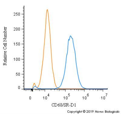 - Flow Cytometry: CD68/SR-D1 Antibody (KP1) [NB100-683] - An intracellular stain was performed on THP-1 cells with CD68/SR-D1 Antibody NB100-683 (blue) and a matched isotype control (orange). Cells were fixed with 4% PFA and then permeabilized with 0.1% saponin. Cells were incubated in an antibody dilution of 1.0 ug/mL for 30 minutes at room temperature, followed by Mouse IgG (H+L) Cross-Adsorbed Secondary Antibody, Dylight 550 (SA5-10033, Thermo Fisher).