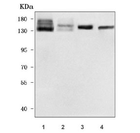 - Western blot testing of 1) human SH-SY5Y, 2) human RT4, 3) rat brain and 4) mouse brain tissue lysate with NHS-like protein 2 antibody. Predicted molecular weight ~133 kDa.