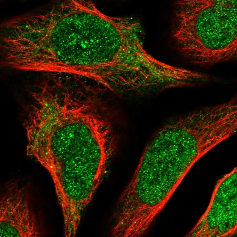 - Immunofluorescent staining of human cell line U-2 OS shows localization to nucleoplasm & cytosol.