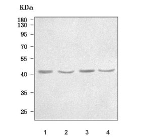 - Western blot testing of 1) human SH-SY5Y, 2) rat brain, 3) rat PC-12 and 4) mouse brain tissue lysate with PRPF18 antibody. Predicted molecular weight ~40 kDa.