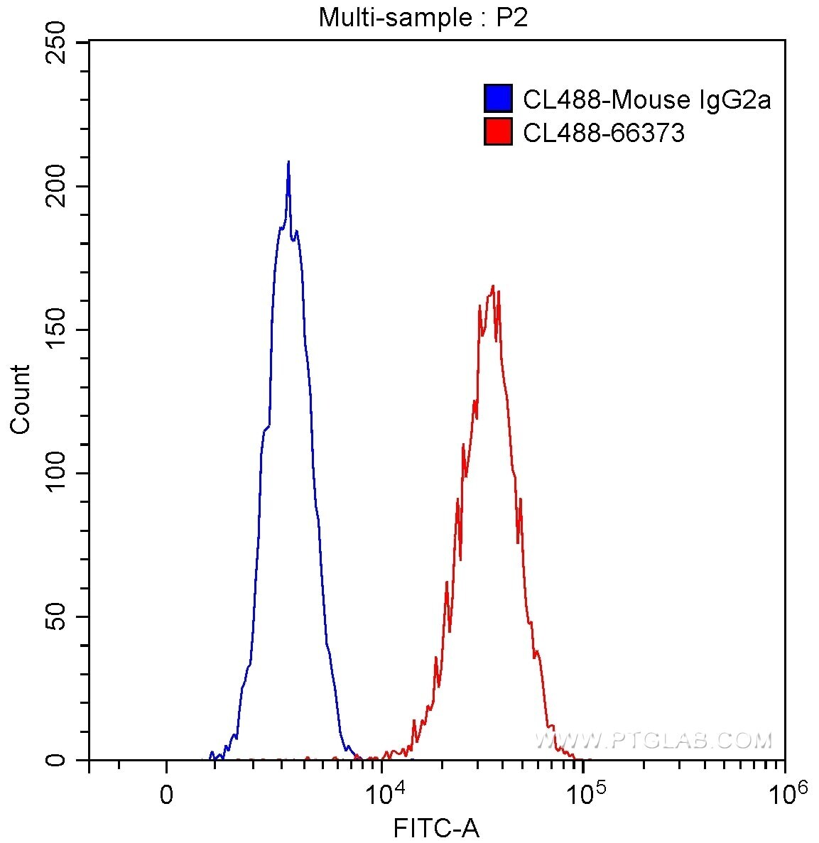 - 1X10^6 HeLa cells were stained with 0.50 µg/test CoraLite®488-conjugated Anti-Human G6PD (Product # CL488-66373, Clone:2A7B12) (red) or 0.50 µg control antibody (blue). Fixed with90% MeOH.
