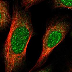 - Immunofluorescent staining of GPATCH3 in human cell line U-2 OS shows positivity in nucleus & cytoplasm. Samples were probed using a GPATCH3 Polyclonal Antibody (Product # PA5-56918).