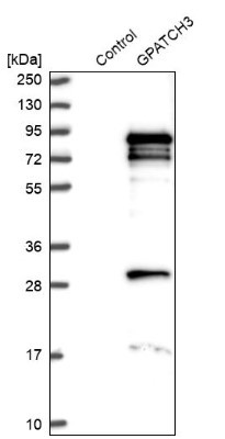 - Western Blot: GPATCH3 Antibody [NBP1-82301] - Analysis in control (vector only transfected HEK293T lysate) and GPATCH3 over-expression lysate (Co-expressed with a C-terminal myc-DDK tag (3.1 kDa) in mammalian HEK293T cells).