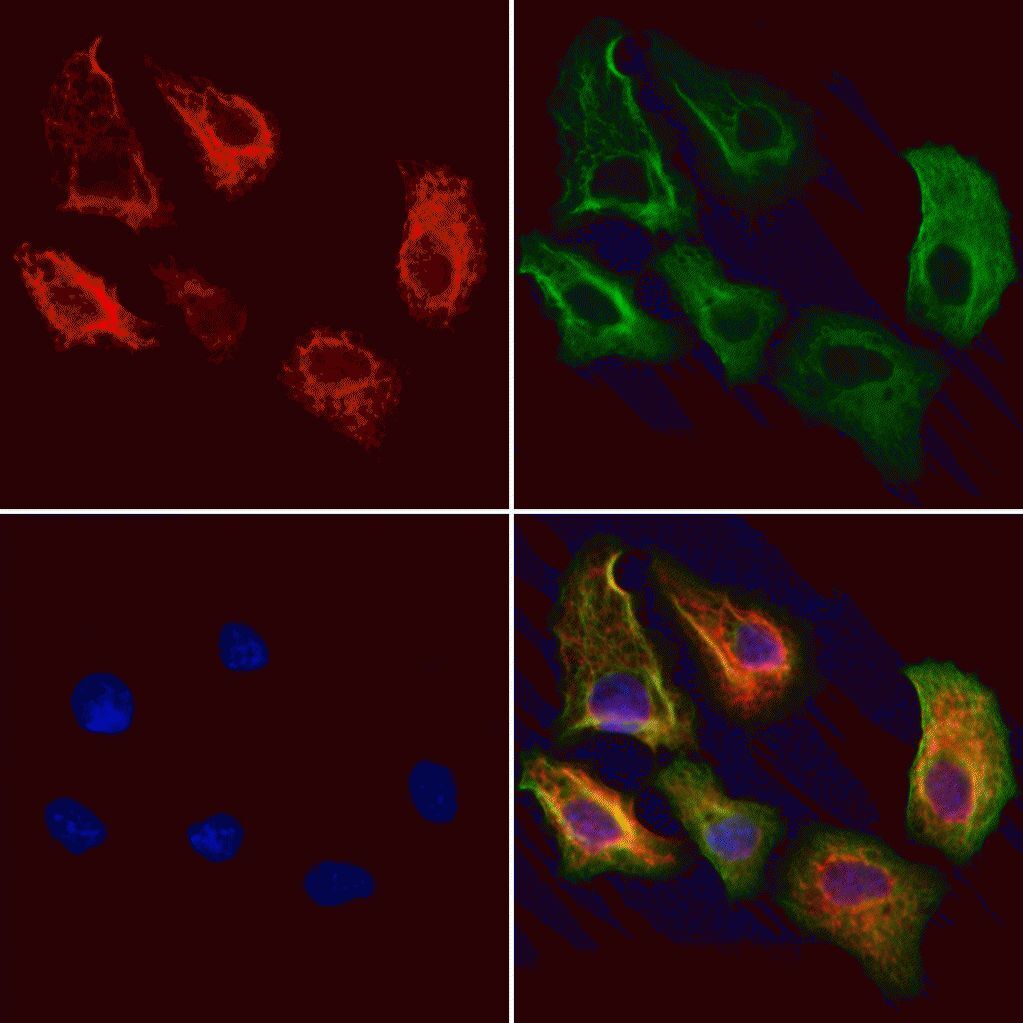 - Immunofluorescent analysis of RNaseH1 in HeLa cells. Samples were fixed with paraformaldehyde, permeabilized with 0.1% Triton X-100, blocked with 10% serum (45 min at 25°C), incubated with mouse anti-beta tubulin and RNaseH1 polyclonal antibody (Product # PA5-100003) using a dilution of 1:200 (1 hr, 37°C), and followed by goat anti-rabbit IgG Alexa Fluor 594 (red) and goat anti-mouse IgG Alexa Fluor 488 (green).