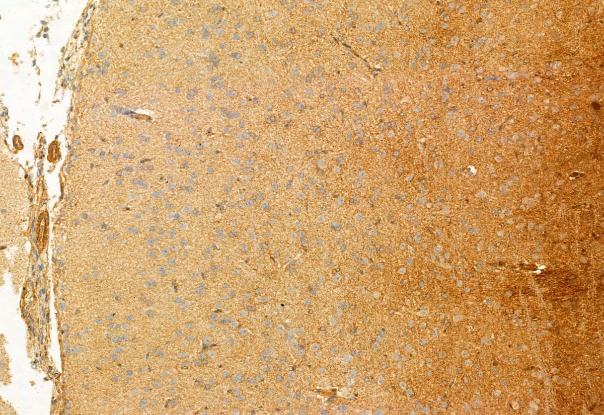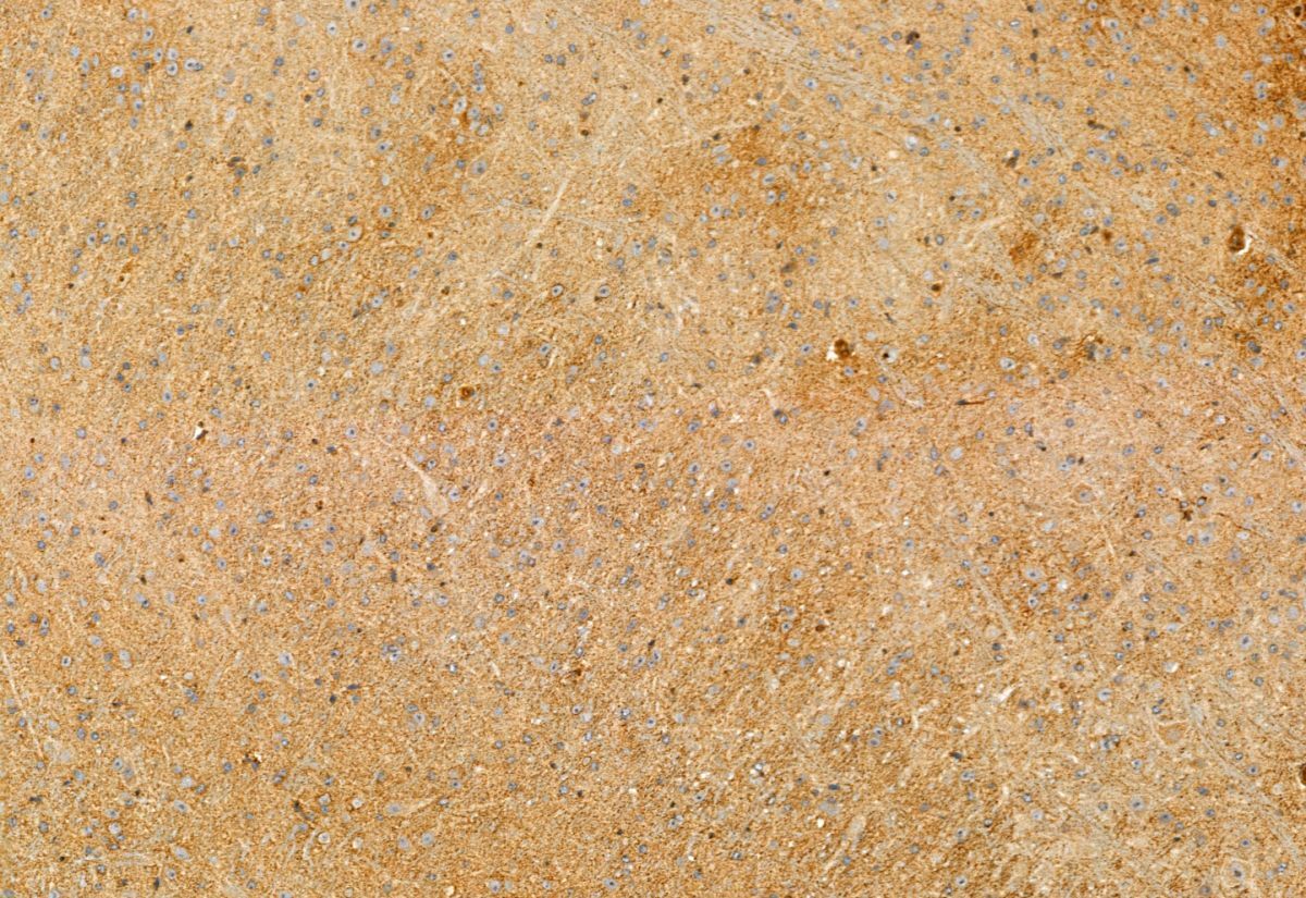 - Immunohistochemistry analysis of RNaseH1 in mouse brain tissue. The sample was formaldehyde fixed and a heat mediated antigen retrieval step in citrate buffer was performed. Samples were incubated with RNaseH1 polyclonal antibody (Product # PA5-100003) using a dilution of 1:100 (4°C overnight) followed by HRP conjugated anti-Rabbit secondary antibody.