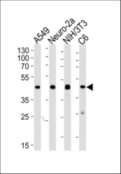 - "Western blot analysis of lysates from A549, mouse Neuro-2a, mouse NIH/3T3, rat C6 cell line (from left to right) using CREB1 Antibody (Cat. # AM2163b). AM2163b was diluted at 1:1000 at each lane. A goat anti-mouse IgG H&L(HRP) at 1:3000 dilution was used as the secondary antibody. Lysates at 35ug per lane."