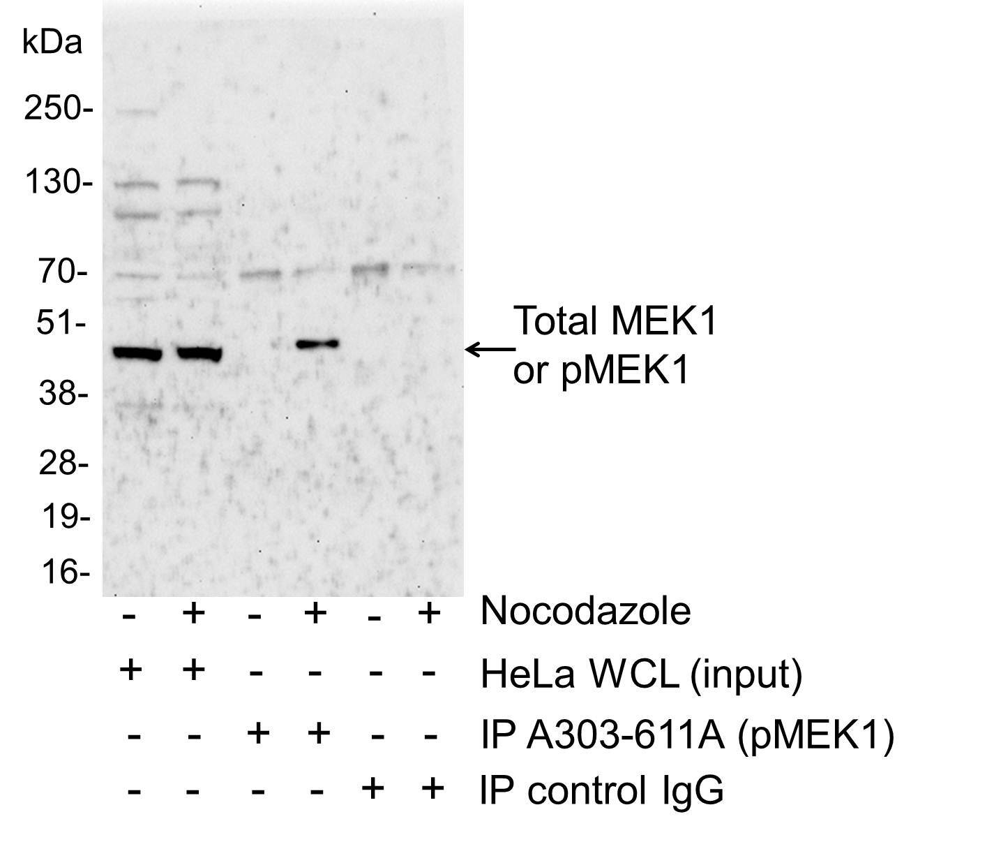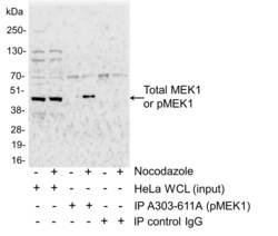 - Detection of human Phospho-MEK1 (T286) by immunoprecipitation (IP). Samples: 50 µg HeLa whole cell lysate (WCL) from mock treated (-) or nocodazole treated (+) cells. 1 mg of HeLa WCL mock treated (-) or nocodazole treated (+) and immunoprecipitated; 20% of the IP was loaded. Antibodies: Affinity purified goat anti-phospho MEK1 (T286) A303-611A was used for IP (6ug/1mg lysate). To detect total MEK1, Rabbit anti-MEK1 (A302-139A) was used for western blot (WB) at 1 µg/ml. Detection: Chemiluminescence with exposure time of 30 seconds.