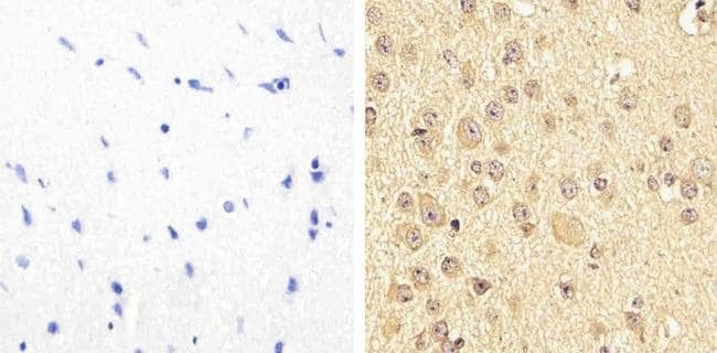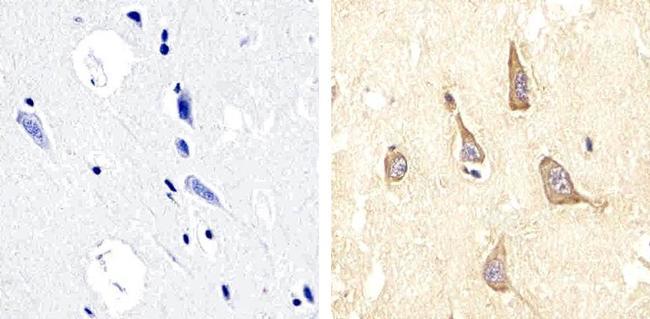 - Immunohistochemistry analysis of Phospho-Pyk2 (pYpY579/580) showing staining in the cytoplasm and nucleus of paraffin-embedded human brain tissue (right) compared to a negative control without primary antibody (left). To expose target proteins, antigen retrieval was performed using 10mM sodium citrate (pH 6.0), microwaved for 8-15 min. Following antigen retrieval, tissues were blocked in 3% H2O2-methanol for 15 min at room temperature, washed with ddH2O and PBS, and then probed with a Phospho-Pyk2 (pYpY579/580) polyclonal antibody (Product # 44-636G) diluted in 3% BSA-PBS at a dilution of 1:20 overnight at 4ºC in a humidified chamber. Tissues were washed extensively in PBST and detection was performed using an HRP-conjugated secondary antibody followed by colorimetric detection using a DAB kit. Tissues were counterstained with hematoxylin and dehydrated with ethanol and xylene to prep for mounting.
