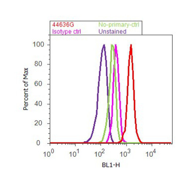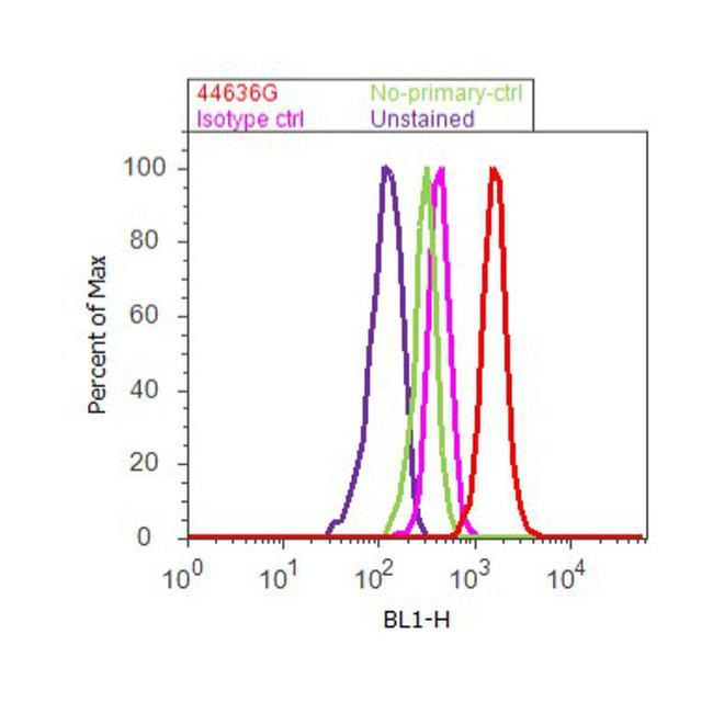 - Flow cytometry analysis of PYK2 [pY580] was done on PC-3 cells treated with Pervanadate (100uM, 1 hour) . Cells were fixed with 70% ethanol for 10 minutes, permeabilized with 0.25% Triton™ X-100 for 20 minutes, and blocked with 5% BSA for 30 minutes at room temperature. Cells were labeled with PYK2 [pY580] Rabbit Polyclonal Antibody (44636G, red histogram) or with rabbit isotype control (pink histogram) at 3-5 ug/million cells in 2.5% BSA. After incubation at room temperature for 2 hours, the cells were labeled with Alexa Fluor® 488 Goat Anti-Rabbit Secondary Antibody (A11008) at a dilution of 1:400 for 30 minutes at room temperature. The representative 10,000 cells were acquired and analyzed for each sample using an Attune® Acoustic Focusing Cytometer. The purple histogram represents unstained control cells and the green histogram represents no-primary-antibody control.