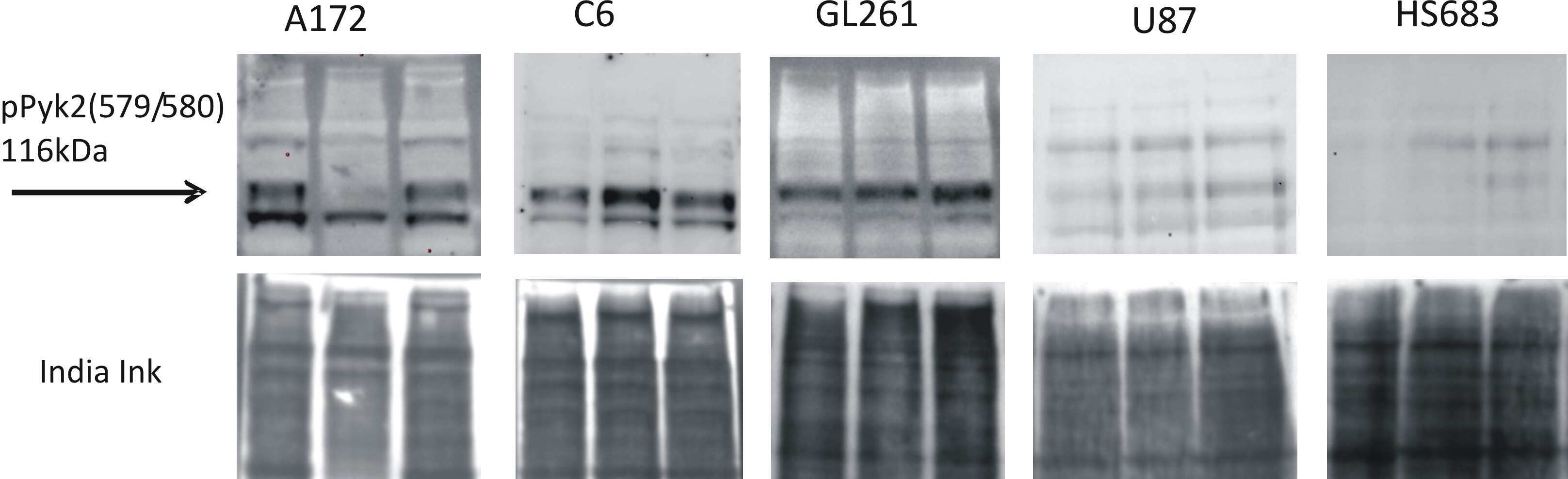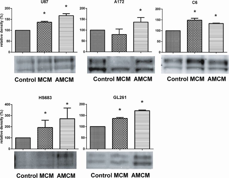 - Fig 3 Factors released from microglia upregulate phosphorylation of Pyk2 in glioma cells. Western blot analysis of pPyk2 (Tyr 579/580) protein in glioma cell lines. The signal is detected at the area corresponding to molecular weight of 116 kDa. The graph shows the density of protein in MCM and AMCM treatments relative to control. Two bands in pPyk2 (Tyr 579/580) detection identify phosphorylation in one or both sites. Intensity of the chemiluminescence signal was corrected for minor changes in protein content after densitometry analysis of the India ink stained membrane. The India Ink stained membranes are provided in S1 Fig . The ""relative density"" axis for HS683 cells is shown in a higher grid scale compare to other cell lines due to higher relative up regulation of Pyk2 phosphorylation in this cell line. Results are presented as mean +- S.D. with significant differences from control (*) (p < 0.05). One-way ANOVA followed by the Tukey's multiple comparison test was used to determine significance between MCM or AMCM groups compared to control. 5 repeated experiments (N = 5) for each cell line were used for statistical analysis.