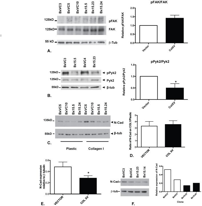 - Figure 4 Collagen XV inhibits phosphorylation of Pyk2 and suppresses N-Cadherin. Vector-only (BxVC3, BxVC4, BxVC5, BxVC10) and COLXV-expressing clones (Bx15.5, Bx15.14, Bx15.23, Bx15.24) were grown on COLI coated plates (A, B,); plastic and COLI (C) or plastic alone (F) and lysed after 48 h. Western blots probed with antibodies specific for A) total FAK or pFAK; B) total Pyk2 or pPyk2; C, F) N-Cad; are shown. ss-tubulin provides an estimate of total protein. Expression of COLXV slightly enhances pFAK relative to FAK (though this is not statistically significant, p = 0.0913), but depresses pPyk2 relative to Pyk2 (* p = 0.0447) and suppresses N-Cadherin levels. Blots were quantified by integrating data acquired with the Lasso tool of Adobe Photoshop (C, D, E, F) and analyzed by students t test (E, *p