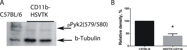 - Fig 5 Local microglia ablation in tumor area reduces phosphorylation of Pyk2 in implanted GL261 glioma tumors in CD11b-HSVTK transgenic mice. (A) Western blot detection of pPyk2 (Tyr 579/580) protein in glioma cells extracted from C57BL/6 and HSVTK-CD11b mice brains after treatment with GCV. Glioma cells were purified using Percoll gradients. (B) The graph shows the quantification of corresponding levels of pPyk2(Tyr 579/580) detected by western blot. Mean +- S.E and significant difference from control (*) is shown (p < 0.05).