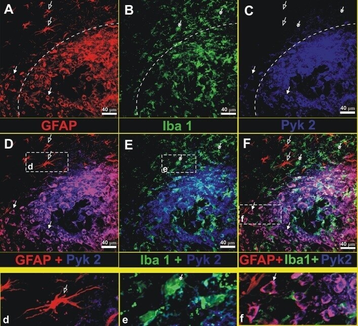 - Fig 2 Pyk2 is mostly detected in glioma cells rather than in other cell types in mouse brain. Immunohistochemistry was performed on C57BL/6 mice brain sections containing the tumor area. GL261 glioma cells were implanted into the brains of C57BL/6 mice and grown for 16 days. Photographs show the tumor and surrounding healthy tissue. The dash line outlines the border of tumor. Anti-GFAP antibody was used to detect glioma cells and astrocytes (red, panel A), anti-Iba 1 antibody was used to detect microglial cells (green, panel B) and Pyk2 detection is presented in blue (panel C). The merged images of anti-GFAP and anti-Pyk2, of anti-Iba1 and anti-Pyk2, and of all antibodies together can be seen in merged image boxes D, E, F correspondingly. Insert panels d , e , and f represent enlarged images of astrocytes, microglia, and invading glioma cells. Solid arrows indicate glioma cells, frame arrows indicate astrocytes, and double headed arrows indicate microglia. Scale bar: 40 mum.
