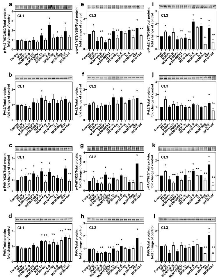 - Figure 2 Cytokines and chemokines released by microglia upregulate Pyk2 and FAK protein phosphorylation in human glioma cells. Representative western blots and quantitative results for total and phosphorylated Pyk2 (Y579/580) and FAK (Y925) are presented for the cell lines CL1 ( a - d ), CL2 ( e - h ), and CL3 ( i - l ). The degree of phosphorylation was calculated as the ratio of phosphorylated Pyk2 or FAK to the total loaded protein and normalized to the control for each kinase. Total protein-stained membranes are provided in Figure S5 . The values are shown as means +- SD for 3-6 experiments per group. * p < 0.05 vs. control; ** p < 0.05 vs. MCM. MCM, microglia-conditioned medium; Inh III, inhibitor III; Bur, burixafor; Toc, tocilizumab; Rep, reparixin; and Gef, gefitinib.