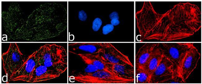 - Immunofluorescence analysis of Phospho-FAK2 / PYK2 (Tyr580) was done on 70% confluent log phase A549 cells treated with 50 ng of PDGF for 10 minutes. The cells were fixed with 4% paraformaldehyde for 10 minutes, permeabilized with 0.1% Triton™ X-100 for 10 minutes, and blocked with 1% BSA for 1 hour at room temperature. The cells were labeled with Phospho-FAK2 / PYK2 (Tyr580) Rabbit Polyclonal Antibody (Product # 44-636G) at 1:250 dilution in 0.1% BSA and incubated for 3 hours at room temperature and then labeled with Goat anti-Rabbit IgG (H+L) Superclonal™ Secondary Antibody, Alexa Fluor® 488 conjugate (Product # A27034) at a dilution of 1:2000 for 45 minutes at room temperature (Panel a: green). Nuclei (Panel b: blue) were stained with SlowFade® Gold Antifade Mountant with DAPI (Product # S36938). F-actin (Panel c: red) was stained with Alexa Fluor® 555 Rhodamine Phalloidin (Product # R415, 1:300). Panel d is a merged image showing membranous localization. Panel e is untreated cell with no signal. Panel f is a no primary antibody control. The images were captured at 60X magnification.